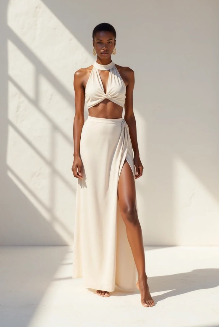 This elegant two-piece set embodies effortless sophistication with a minimalist yet sensual design, perfect for warm climates and refined occasions. Crafted from lightweight, breathable fabric, it drapes beautifully over the body, creating a fluid and graceful silhouette.