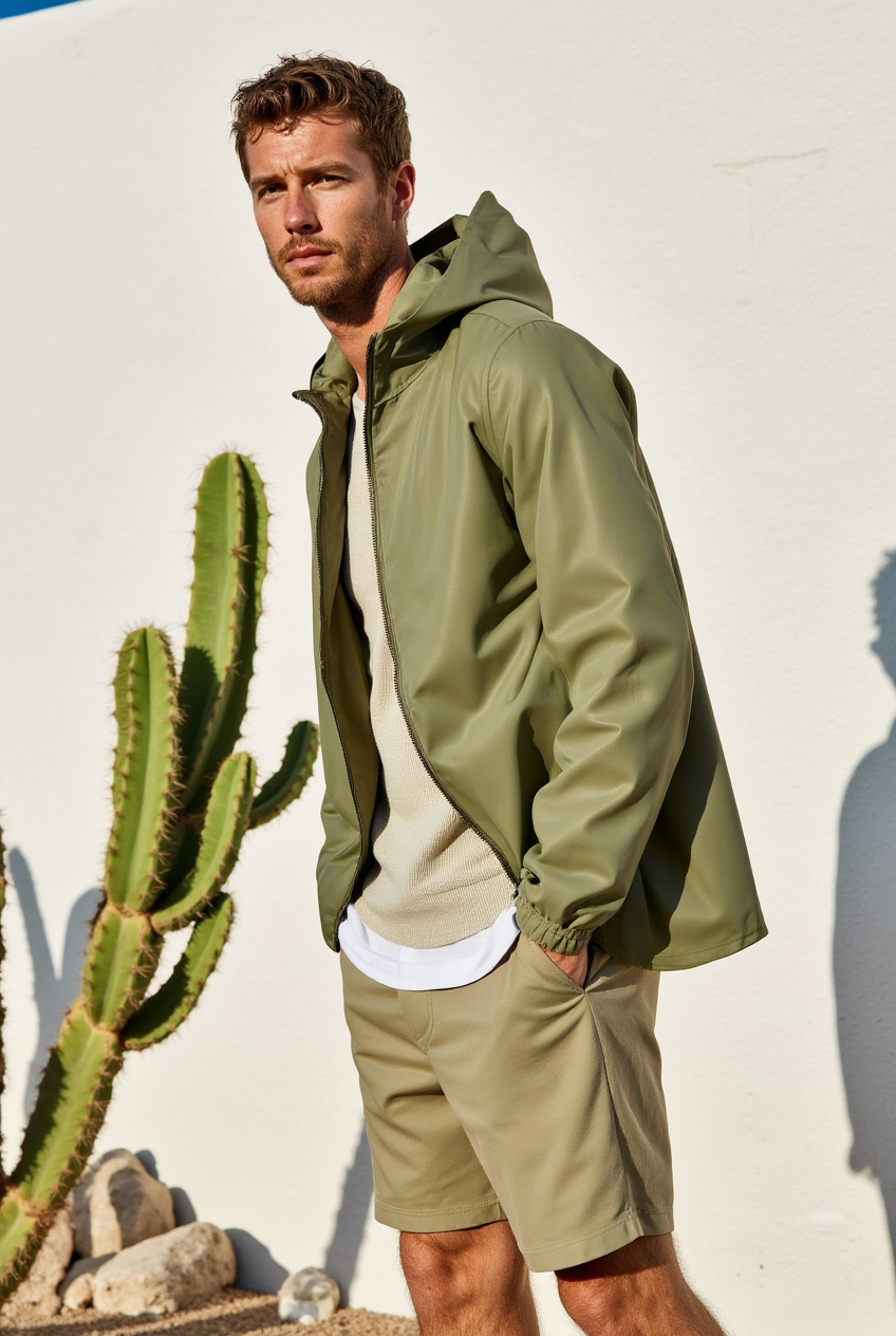 Built for warm weather and unexpected showers, this olive green summer rain jacket offers sleek functionality and breathable comfort. Crafted from a water-repellent technical shell, it features a lightweight, unlined construction, making it ideal for rainy summer days without adding bulk.