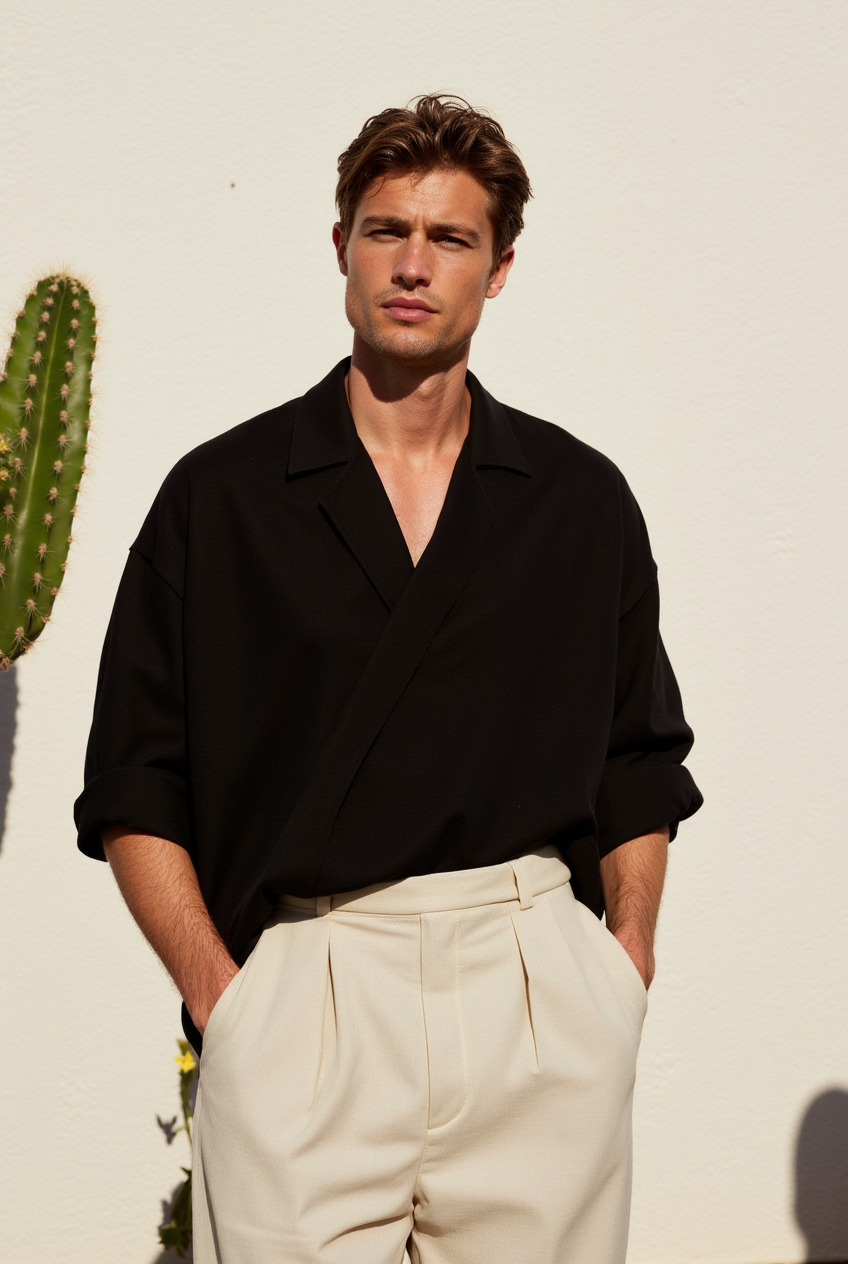 Designed with a cross-over front and a sharp, open collar, it fuses modern tailoring with Eastern-inspired structure—perfect for the refined man who embraces simplicity with character.