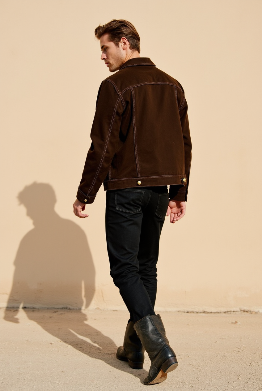 This chocolate brown suede trucker jacket blends the rugged spirit of classic Americana with the elegance of modern craftsmanship. Made from premium brushed suede, it features a structured silhouette, signature front flap pockets, and metal button hardware that adds durability with refined contrast.