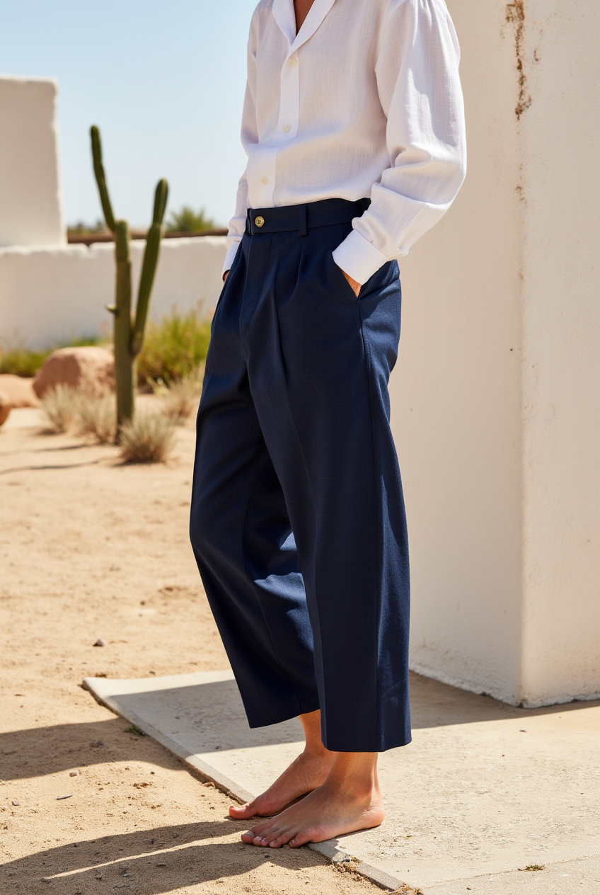 Sharp, fluid, and timeless, these navy pleated trousers blend classic tailoring with relaxed summer elegance. Crafted from a lightweight, structured wool-viscose blend, they feature a high-rise waist, single front pleats, and a wide-leg silhouette that flows naturally with movement.