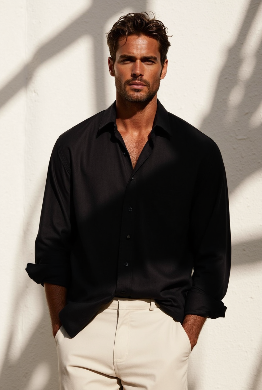 Minimalist yet impactful, this black long-sleeve cotton shirt embodies effortless sophistication. Crafted from a lightweight, breathable cotton fabric with a clean matte finish, it offers a flattering silhouette with timeless appeal.