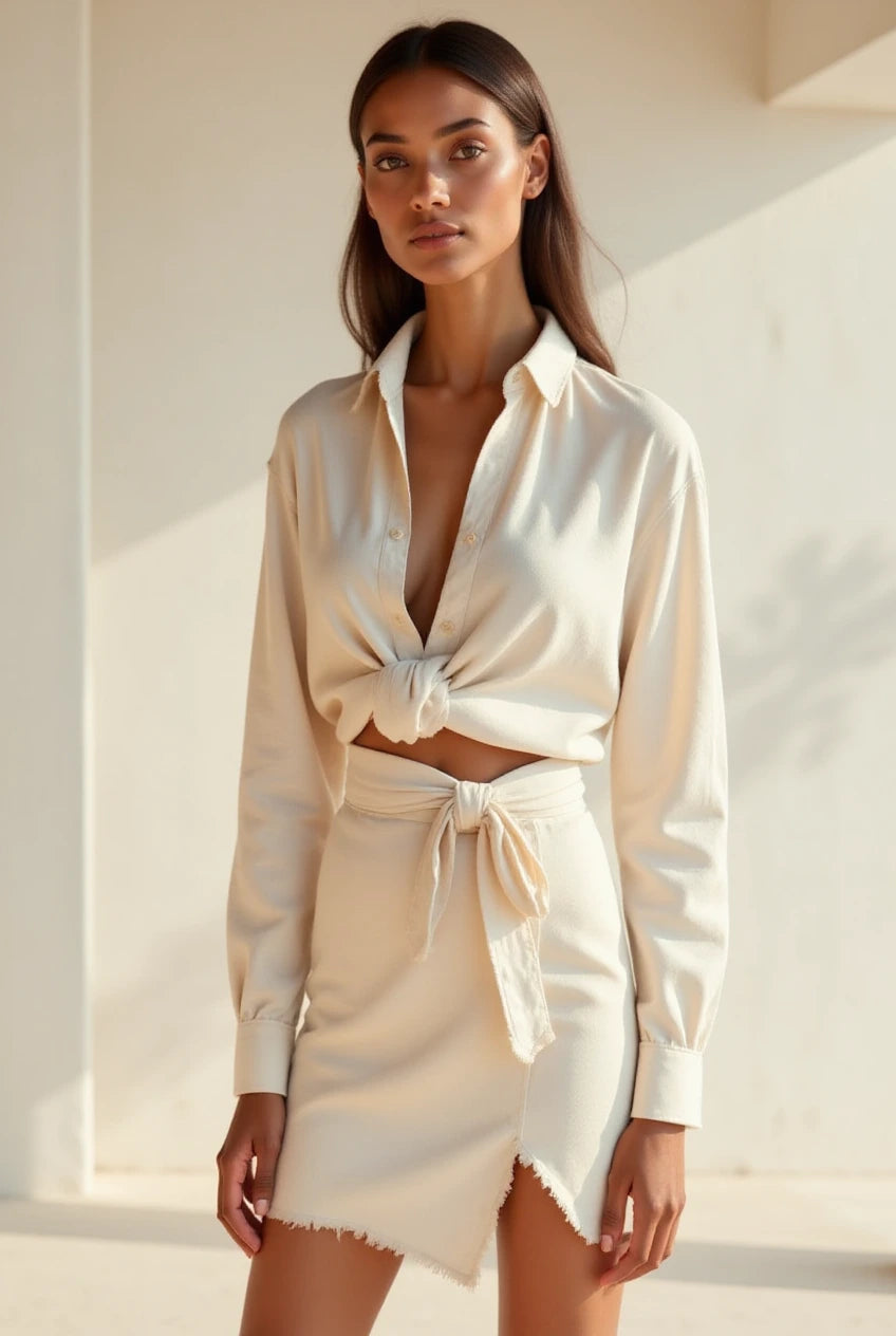 The matching high-waisted wrap skirt complements the look with an adjustable waist tie for a customized fit. The raw-cut hem and asymmetrical slit create movement and a subtly edgy finish while maintaining a chic and feminine aesthetic.