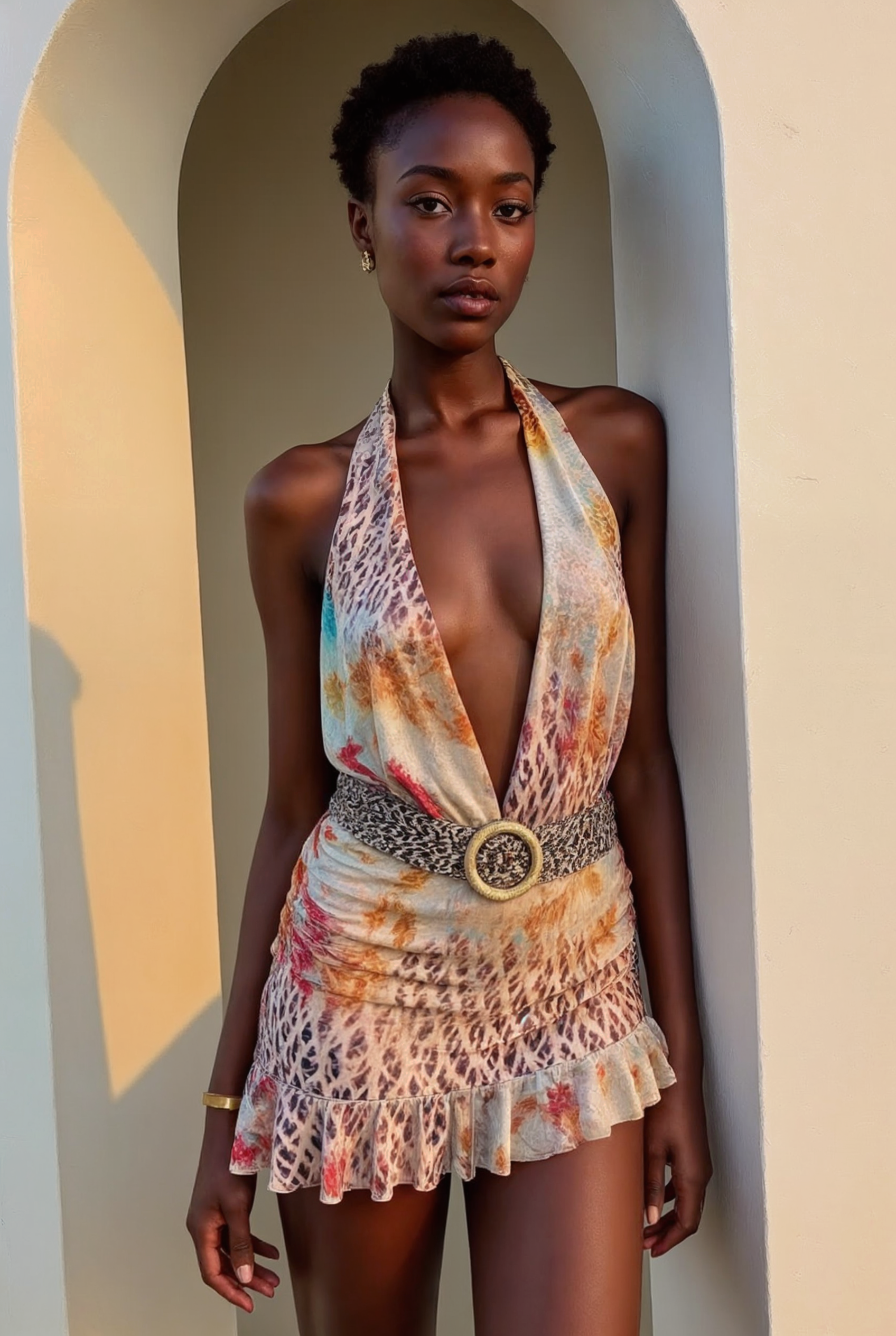 Radiating sunset elegance, this halter mini dress combines safari-inspired prints with soft femininity. The deep plunge neckline adds a daring edge, while the soft, ruched fabric hugs the waist and hips, creating a flattering hourglass silhouette.