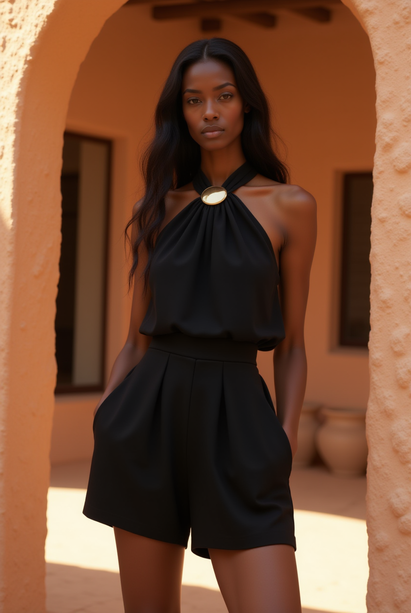 Minimalist black halter-neck playsuit with a central gold ring at the neckline, softly draped fabric on top, and high-waisted structured pleated shorts.